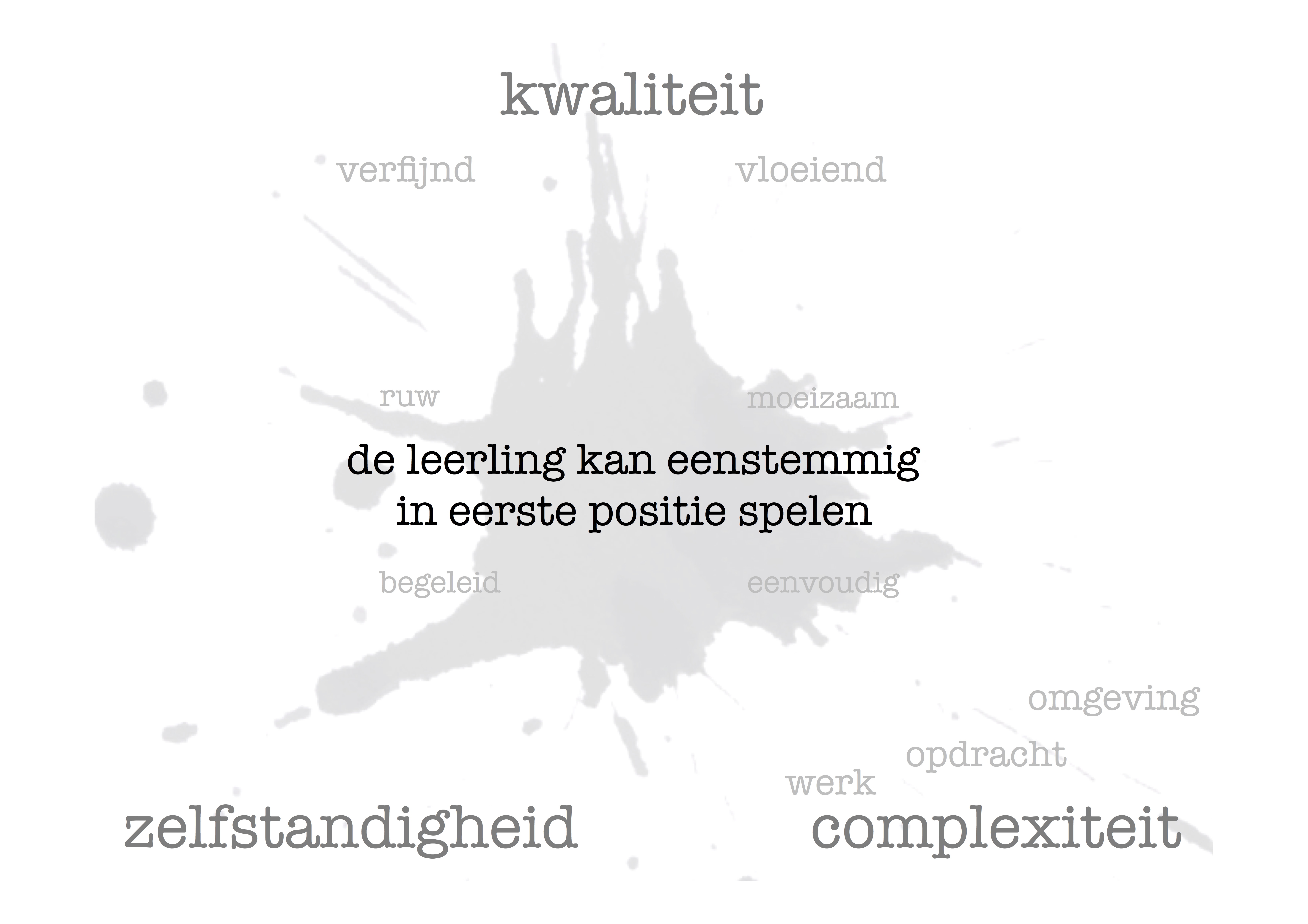 Je kan een competentie in vier richtingen ontwikkelen. We geven een voorbeeld aan de hand van de competentie: de leerling kan éénstemmig in eerste positie spelen.