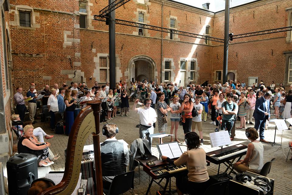 De lokatie was zonder meer prachtig: het binnenplein van het kasteel van Alden Biesen. Muziekgroepen van de academie zaten in de verschillende hoeken van de binnenkoer. 80 leerlingen en leraren. Het publiek stond in het midden. Johan Bossers nodigde de aanwezigen uit om zich te verplaatsen tijdens het concert. Dat was een fantastische ervaring: op elke plek klonk het anders. Je kleurde al wandelend de compositie mee in.
