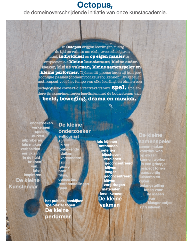 Het beeld doet ook vermoeden dat hier speels gewerkt wordt. De naam van het vak, Octopus, maakt al duidelijk dat hier veel artistieke vertakkingen gemaakt worden. En de kleine rollen (kleine kunstenaar, kleine performer, kleine vakman..) doen verlangen naar een lang en rijk traject om een groot kunstenaar te worden.