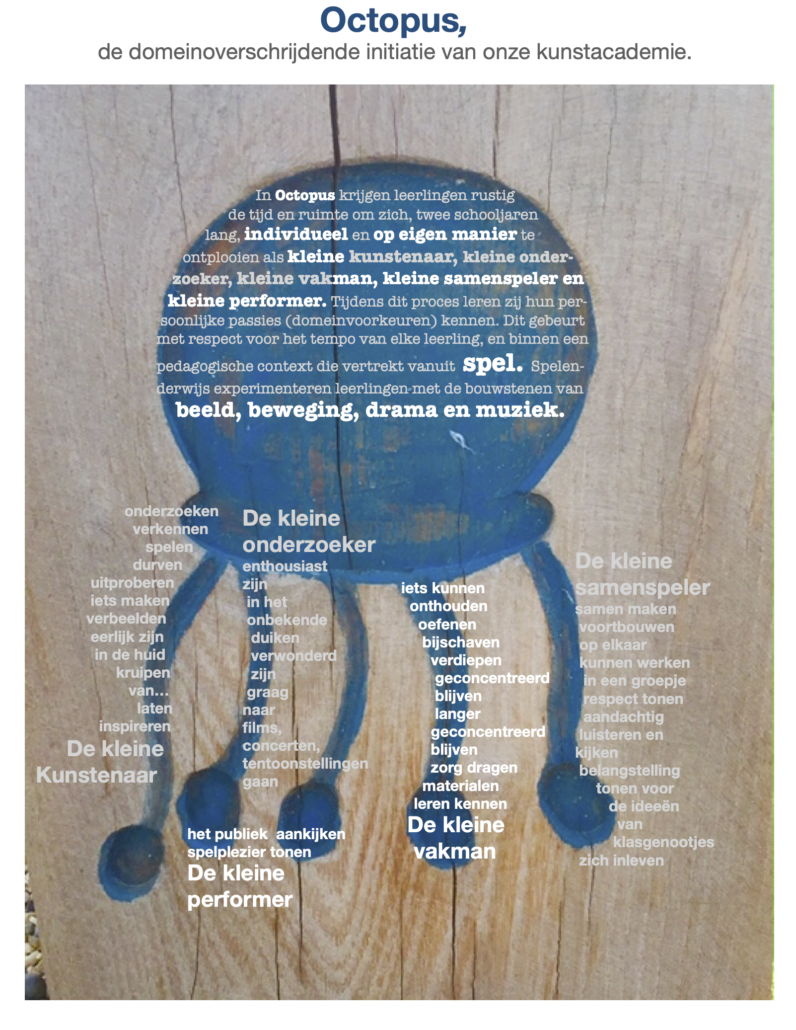 Het beeld doet ook vermoeden dat hier speels gewerkt wordt. De naam van het vak, Octopus, maakt al duidelijk dat hier veel artistieke vertakkingen gemaakt worden. En de kleine rollen (kleine kunstenaar, kleine performer, kleine vakman..) doen verlangen naar een lang en rijk traject om een groot kunstenaar te worden.