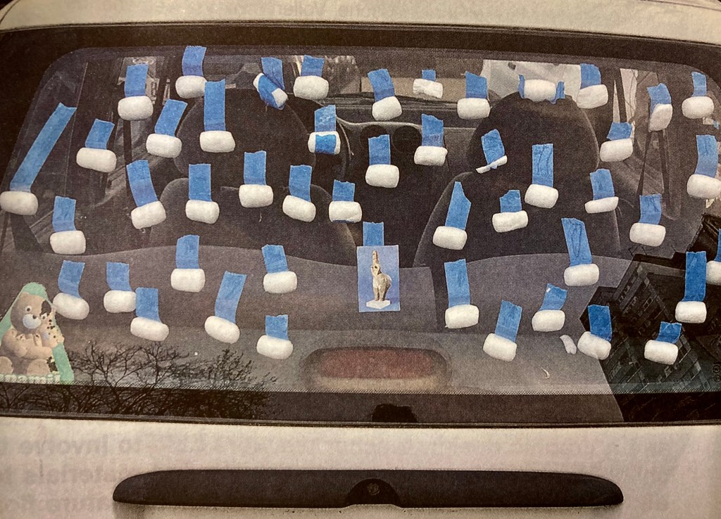 Toen ik deze twee beelden in het boek Wicked Arts Assignments zag, besefte ik dat we met ons creatief vermogen het verschil kunnen maken. Want zeg nu zelf, een tentoonstelling op het achterraam van je auto, dat is toch geniaal gevonden.
